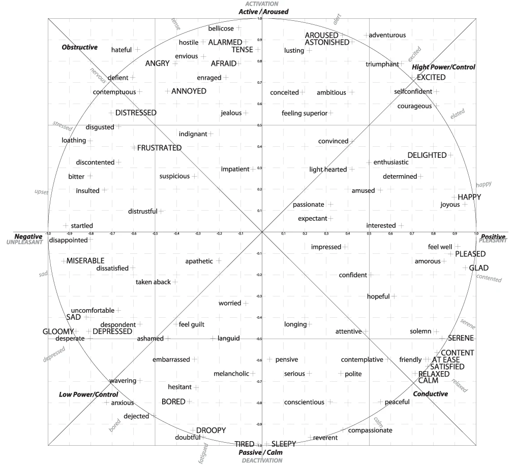 In emotional health, valence and arousal are like the X and Y axes of your feeling-world. Valence is how pleasant or unpleasant an emotion feels (positive vs. negative), and arousal is how activated or energized it is (high vs. low). Put together, they create a simple map: any emotional state you’re in can be described by how good or bad it feels and how revved up or calm your body is. Understanding this map helps you recognize that emotions aren’t just “good” or “bad”—they’re more like locations you move through, and different locations call for different kinds of care and response. Together, valence and arousal create a map of emotions that we can use to gauge what we are feeling.